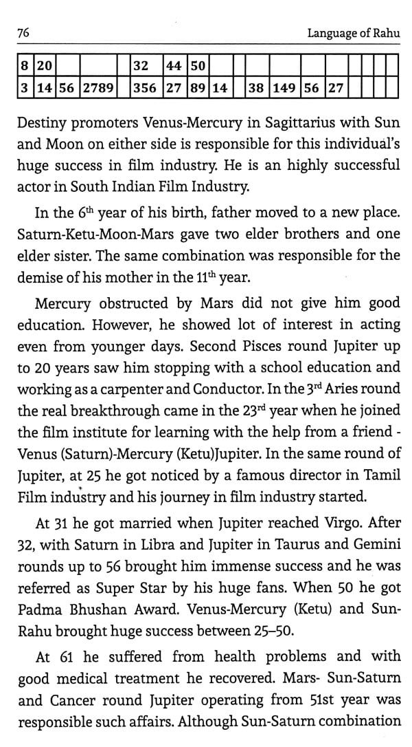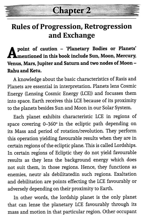 This book deals with its own Naadi method with an assurance for better accuracy in predictions. It presents complex rules of Planetary Progression, Retrogression and Exchange with examples and makes it less ambiguous. The methods of working out planetary positions at any period of time in an individual’s life for accurate predictions are clearly explained in the book. The rules presented in this book are different from one the author had talked about in his earlier book. It uses them to logically address the procedures for accurate predictions. This is an ideal text-book for beginners of astrology.